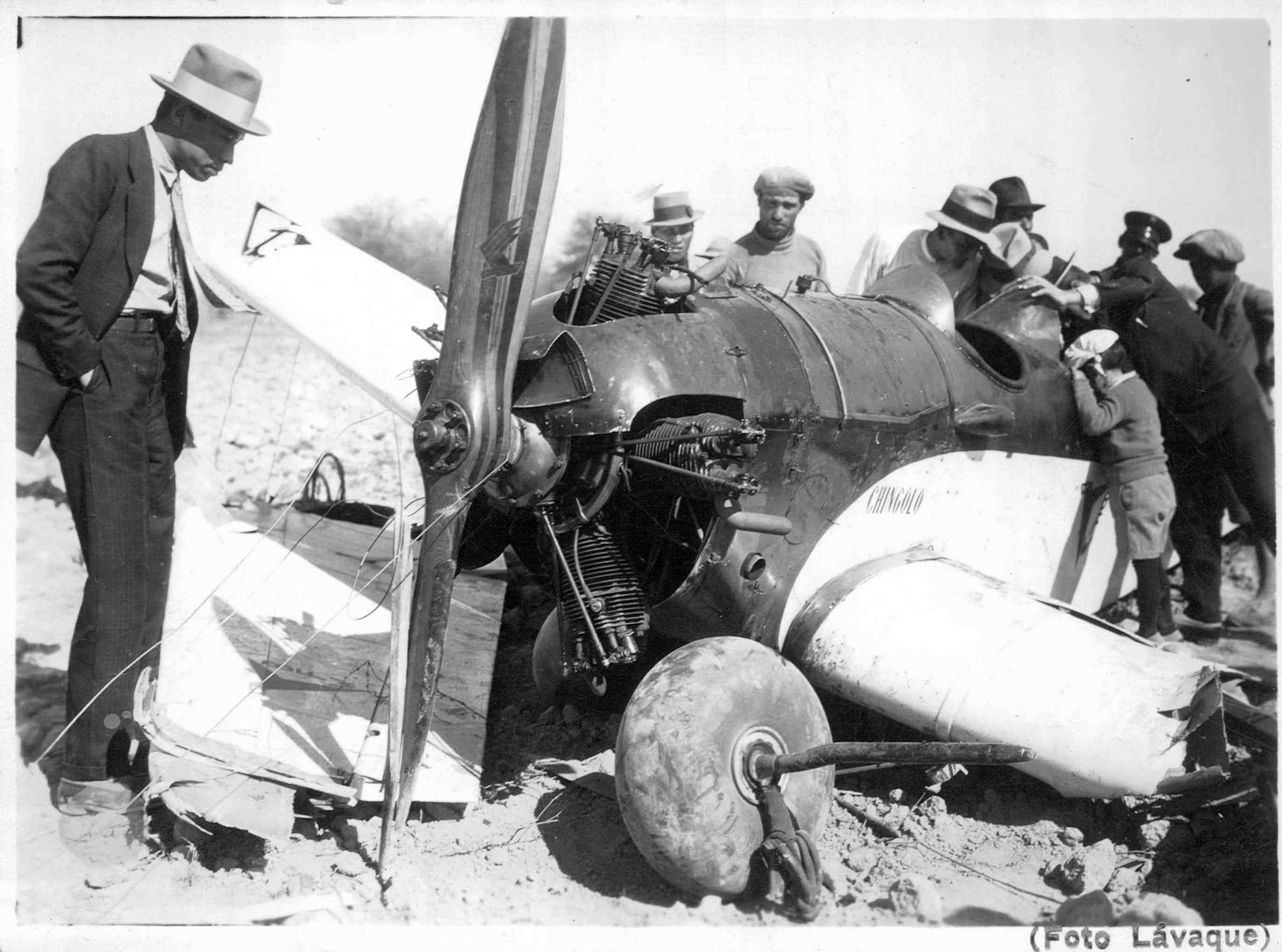 Una vez en tierra, me entero de que nos encontrábamos en Los Cerrillos, a 20 Km de Salta! Tan lejos nos había desviado el viento de costado que soportamos durante las cinco horas de vuelo. Inmediatamente decido decolar a pesar de lo malo del terreno. El Chingolo corre dando saltos; sube y vuelve a caer ya que el campo le impide desarrollar la velocidad necesaria para elevarse. ¡300 metros continuamos así! Avanzamos a una velocidad de 100 kilómetros en dirección a unos árboles y cuando estábamos muy cerca de ellos, el Chingolo despega…Para evitar el choque con los árboles, inclino un poco el ala del avión y una de las alas roza el hilo superior de un alambrado, el cual salta enroscándose en la hélice transformándose en un látigo sobre mi avión que se inclina aun más y ya se me confunde cielo y tierra…